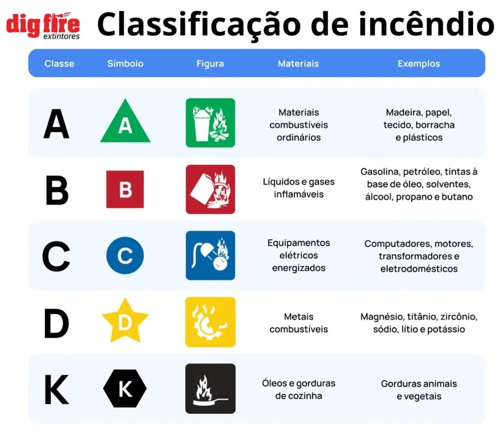 Antes de detalhar a classificação de extintores, é importante entender as classes de incêndio, que são definidas pelos materiais combustíveis envolvidos: