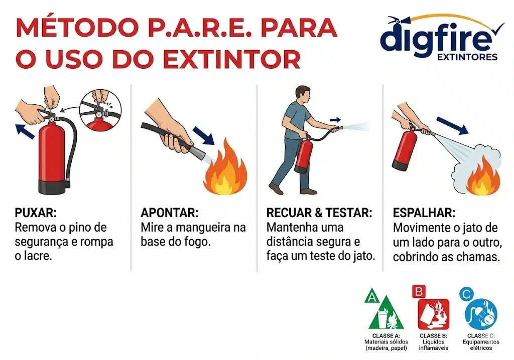 A técnica internacionalmente aceita sobre extintor como utilizar é conhecida pela sigla P.A.R.E. (ou P.A.S.S. em inglês). Siga estas instruções rigorosamente para garantir a máxima eficiência no combate às chamas.