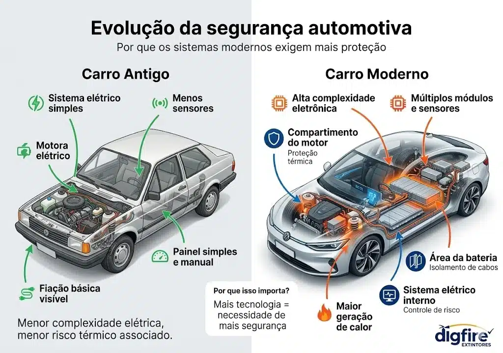 Atualmente, os veículos saem de fábrica com fiações protegidas por fusíveis de alta precisão e utilizam materiais internos com tecnologia retardante de chama, o que reduz drasticamente a chance de um sinistro se propagar rapidamente pela cabine de passageiros. Além desse fator de evolução tecnológica, a análise das ocorrências envolveu a eficácia do uso do equipamento por leigos.
