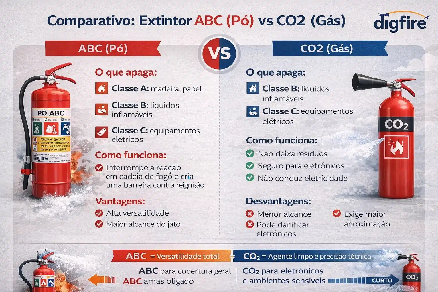 A principal diferença prática é que o extintor ABC deixa um pó fino e branco que exige limpeza profunda, enquanto o CO2 evapora completamente, não deixando nenhum vestígio físico ou químico no local após a aplicação direta.